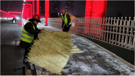 2月17日傍晚7:30至凌晨1點,申飛建工公司出動撒布車3臺,清運車3臺,鐵鍬20把,推雪鏟10把,搶險隊員30余人,對申城大橋、民權大橋、新十八大街高架橋撒布融雪劑4噸,對有坡度的人行道鋪墊防滑草墊。。